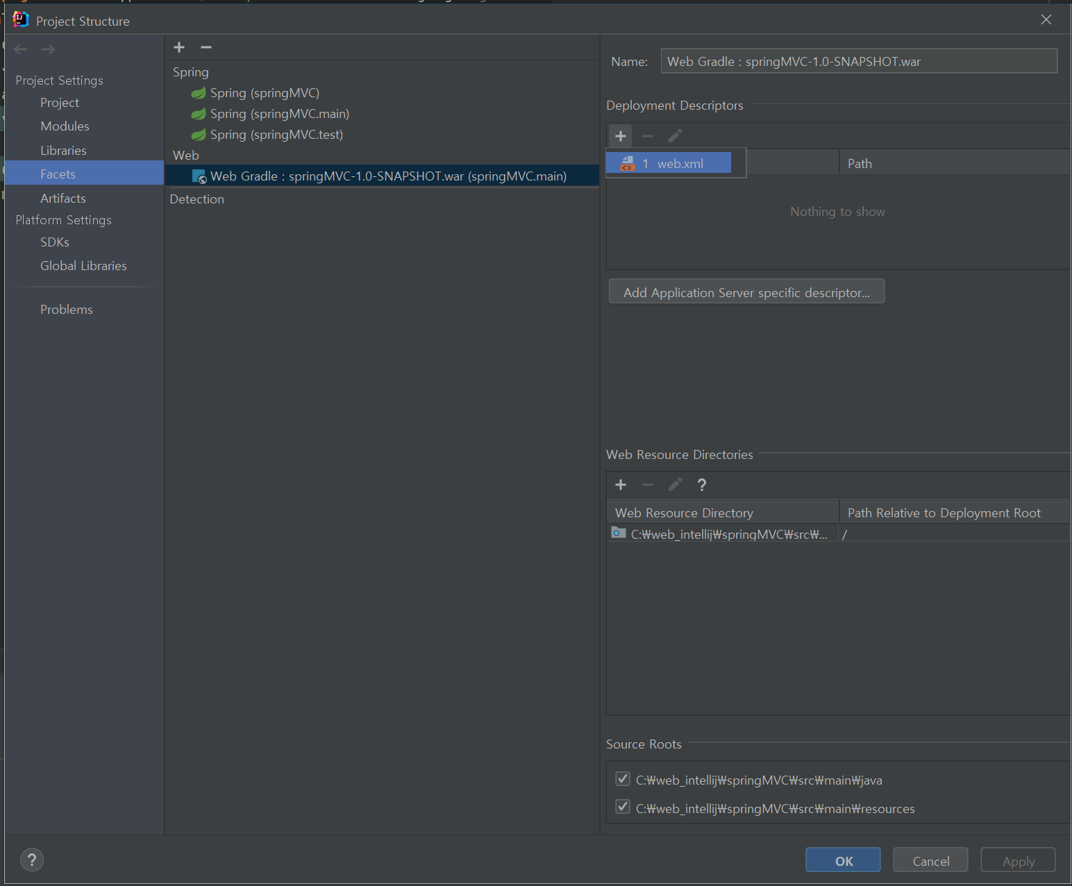 Facets -> Web 목록 클릭 -> +버튼 web.xml 클릭 -> ok