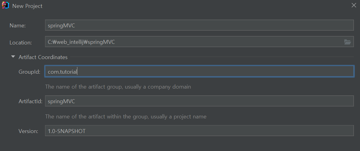 프로젝트명, 그룹ID 등 작성 후 Finish