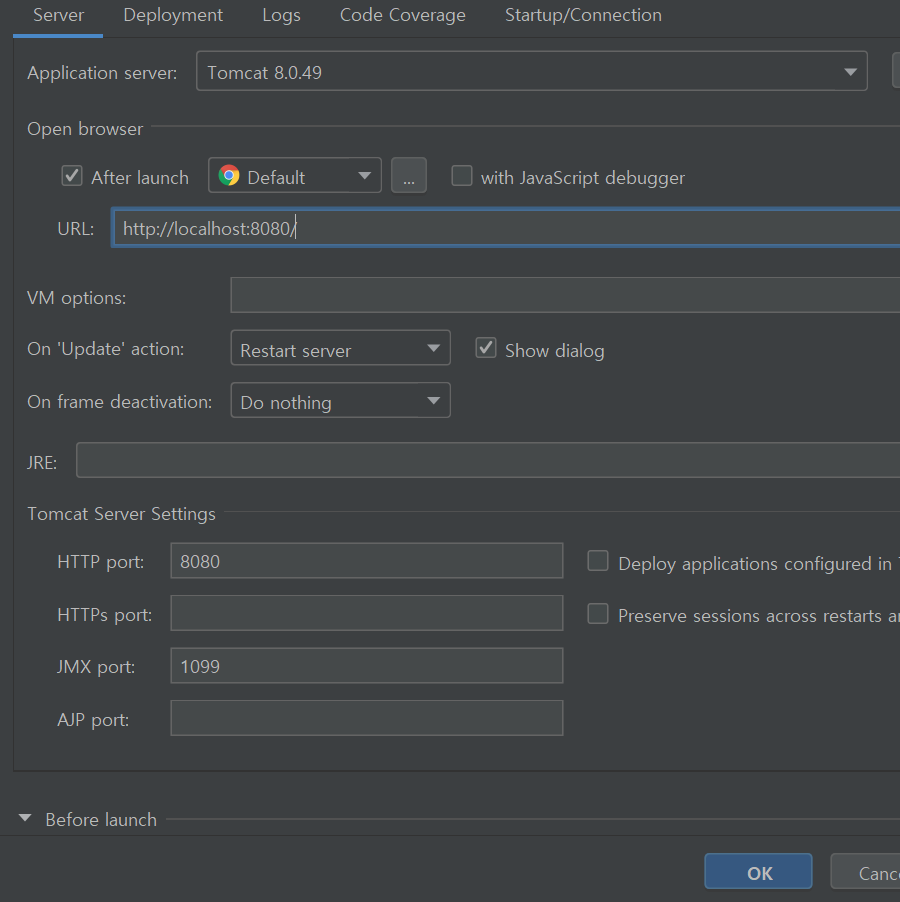Server 탭으로 돌아가서 URL 뒤에 붙은 것 제거