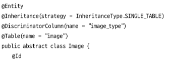 - @Inheritance 에너테이션을 사용하고, @DiscriminatorColumn을 사용하여 타입 구분 칼럼 지정