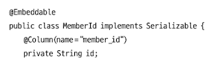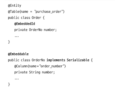 - 식별자라는 의미를 부각하기 위해 식별자 자체를 벨류 타입으로 만들 수 있음. @Id 대신 @EmbeddedId