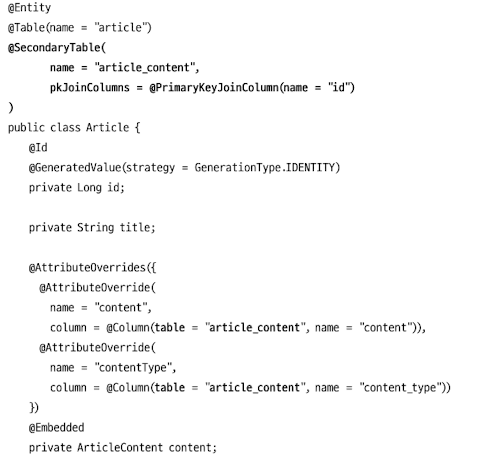 - @SecondaryTable과 AttributeOveride를 이용해 벨류를 매핑 한 테이블을 지정