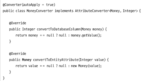 - AttributeConverter을 통해 벨류 타입과 칼럼 데이터 간의 변환 처리 가능