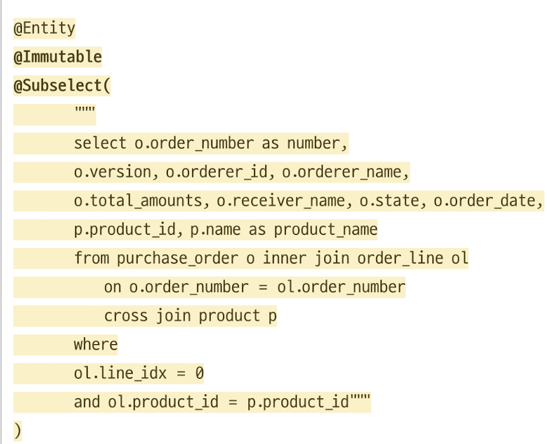 @Subselect는 쿼리 결과를 @Entity로 매핑함
