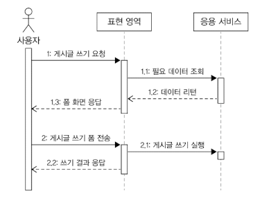 - 응용 서비스를 실행한 뒤에 표현 영역은 실행 결과를 사용자에게 알맞은 형식(HTML/JSON)으로 응답
