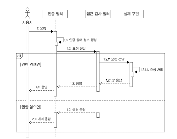 표현 영역에서 권한 검사 수행 : 서블릿 필터 등을 통해 인증된 사용자인지 아닌지 검사