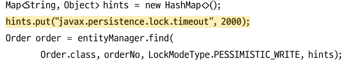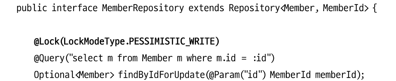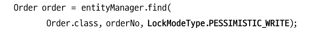 Jpa EntityManager.find() 함수를 통해 선점 잠금 방식을 사용할 수 있다. LockModeType을 PESSIMISTIC_WRITE를 사용하면 된다.