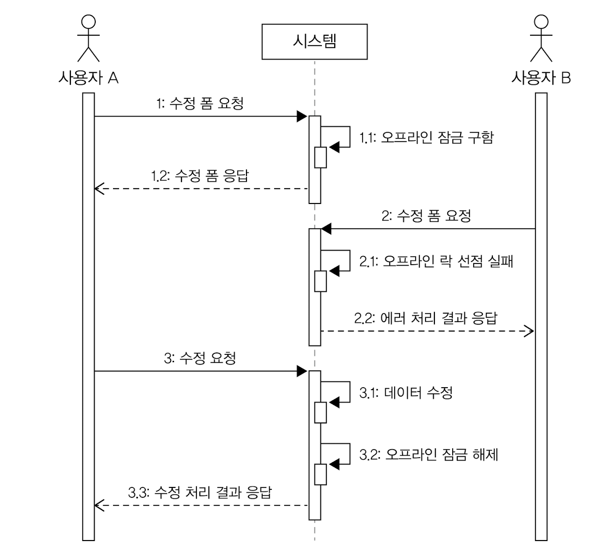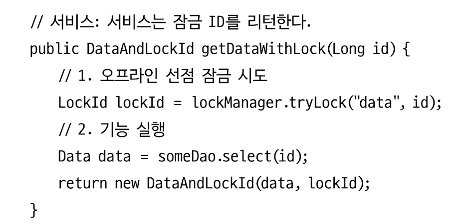 첫 트랜젝션 시작 시 오프라인 잠금을 선점하고, 마지막 트랜젝션에서 잠금을 해제.