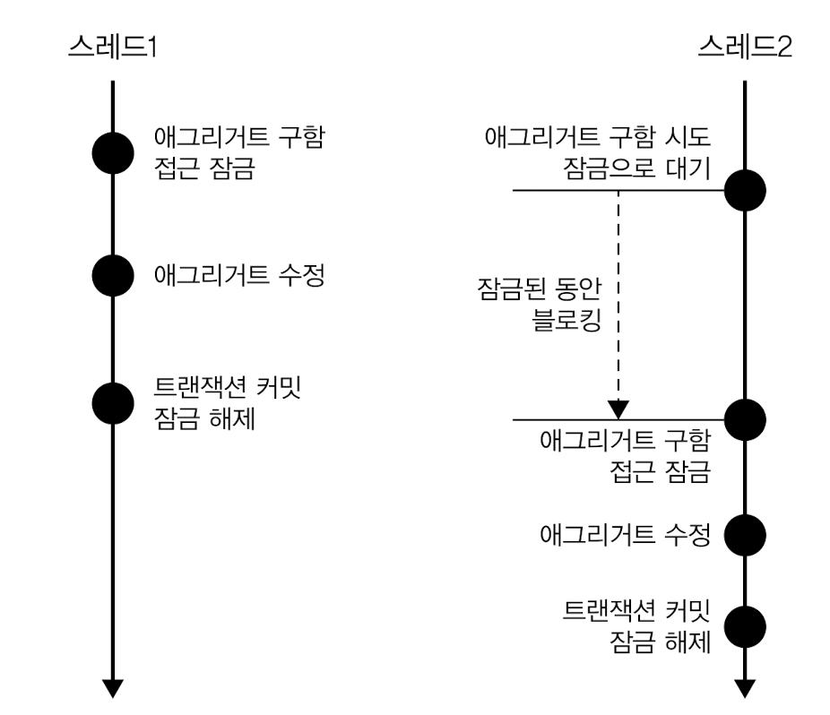 스레드 1이 선점 잠금 방식으로 애그리거트를 구하면, 스레드2 는 애그리거트에 대한 잠금이 해제할 때까지 블로킹(Blocking)된다.
