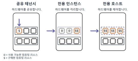 - 전용 인스턴스는 호스트 하드웨어 수준에서 물리적으로 격리되는 EC2 인스턴스 즉, 전용이 아닌 인스턴스와 다른 AWS 계정에 속하는 인스턴스로 부터 격리