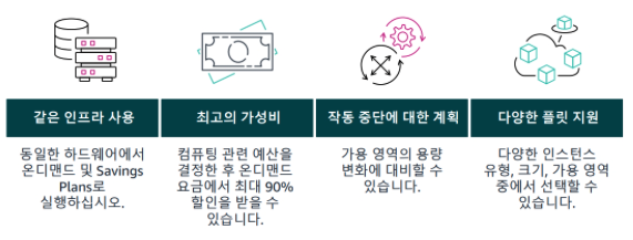 - 내결함성을 갖춤 워크로드, 유동적 워크로드, 느슨하게 결합된 워크로드, 상태 비저장 워크로드에 적합
