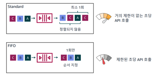 - FIFO : 작업 및 이벤트 순서가 중요하거나 중복 허용하지 않는 경우 사용. 정확히 한 번 처리하나, 초당 API 호출 수 제한
