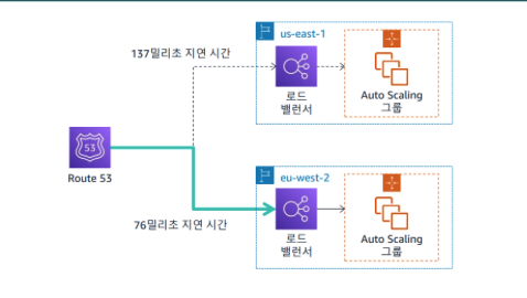 - 지연 시간 라우팅 정책 : 여러 AWS 리전에 리소스가 있고 더 짧은 왕복 시간으로 가장 짧은 지연 시간을 제공하는 리전으로 트래픽을 라우팅하려는 경우 사용