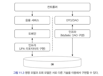 예를 들어 명령 모델은 객체지향에 기반하여 도메인 모델을 구현하기에 JPA를 사용하고 ,