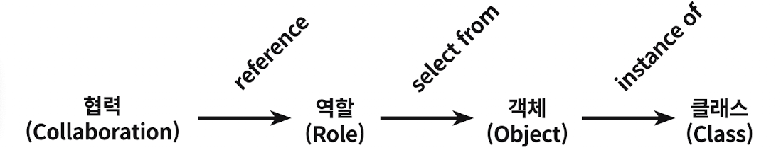 실체로 협력을 모델링 할때는 어떠한 객체가 아닌 역할에 책임을 할당한다고 보는 것이 맞다.