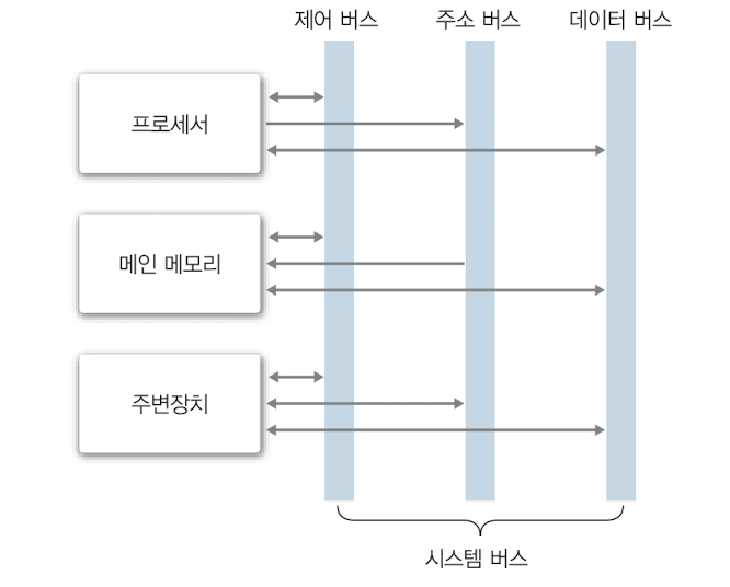 - 주소 버스 : 프로세서가 시스템의 구성 요소를 식별하는 주소 정보를 전송
