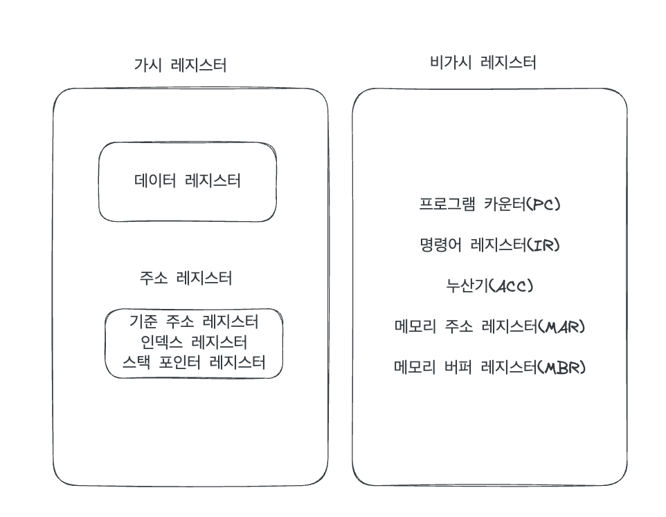 사용자가 직접 정보를 바꿀 수 있는지의 여부에 따라 가시/비가시 레지스터로 구분 가능하다.