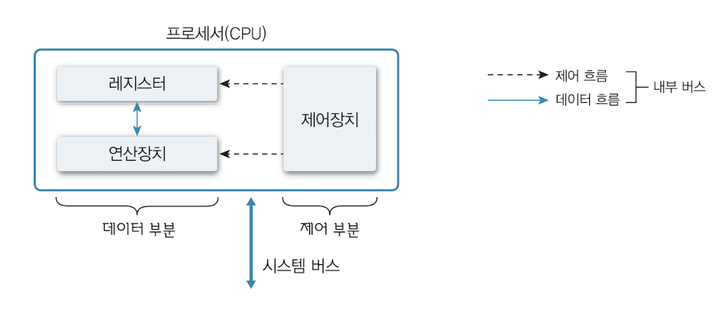 프로세서는 연산장치, 제어장치, 레지스터로 구성되고, 이들은 내부 버스로 연결한다.