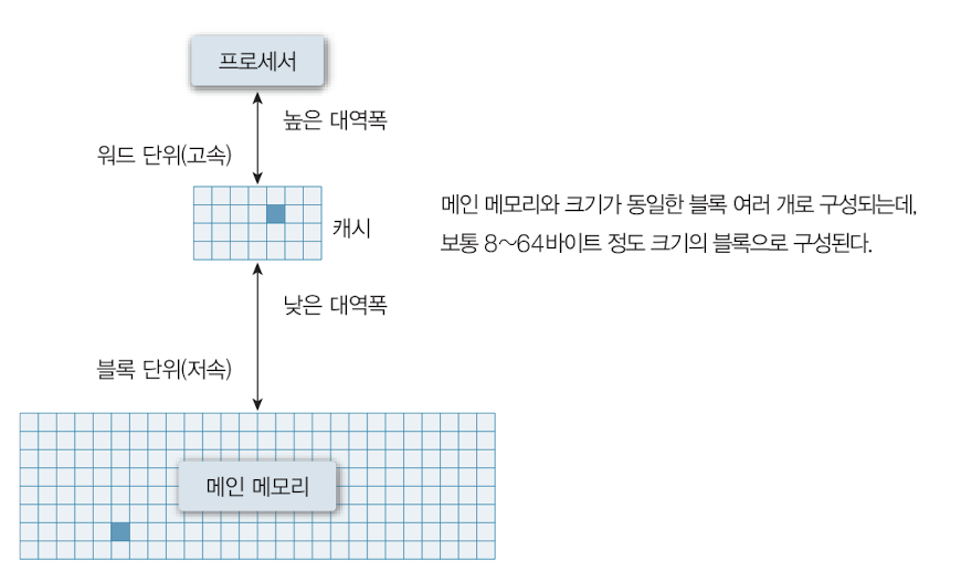 다음과 같이 메인 메모리에서 데이터를 블록 단위로 가져와 프로세서에 워드 단위로 전달하고, 데이터가 이동하는 대역폭을 확대한다.