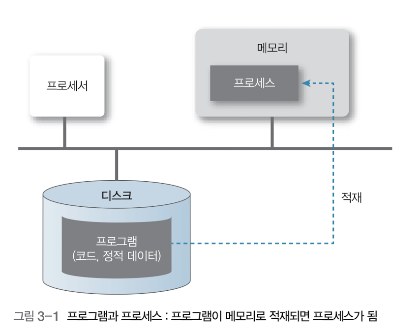 실행중인 프로그램이라는 것은 디스크에 있던 프로그램을 메모리에 적재하여 운영체제의 제어를 받는다는 의미이다.