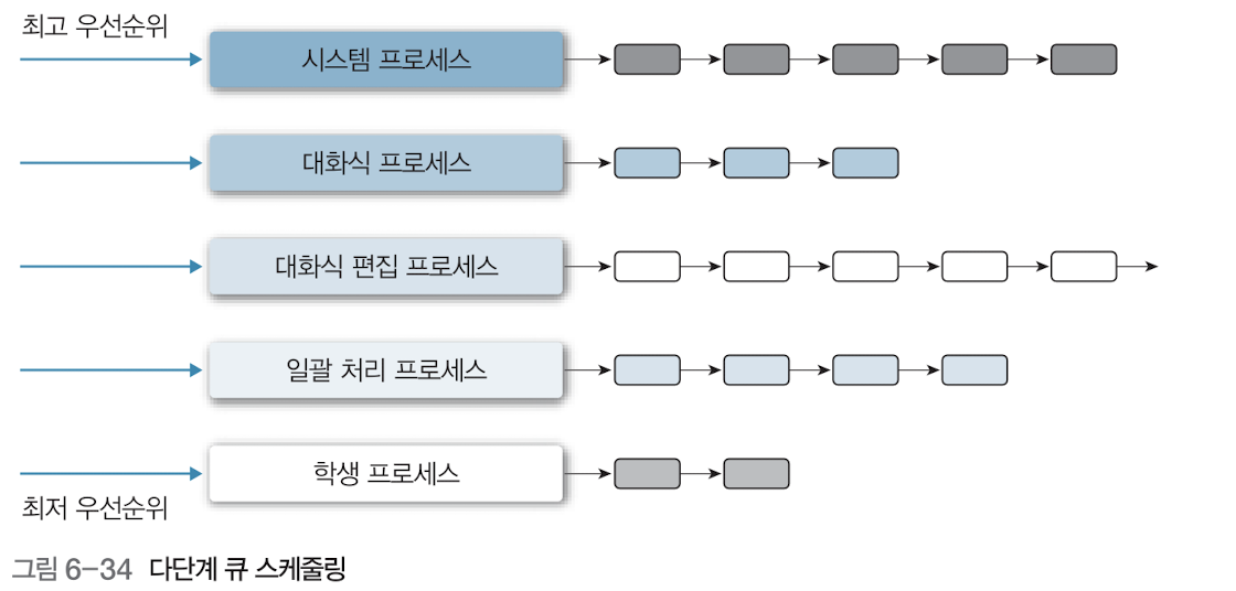 각 큐는 독자적인 스케줄링을 가지면서, 가장 높은 우선순위 큐부터 실행한다