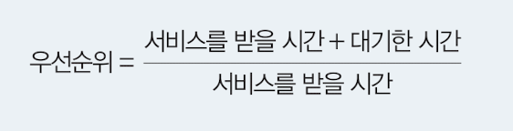 실행시간이 짧을수록, 대기시간이 길 수록 우선순위가 높다.