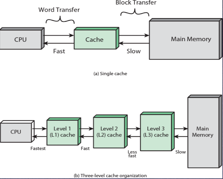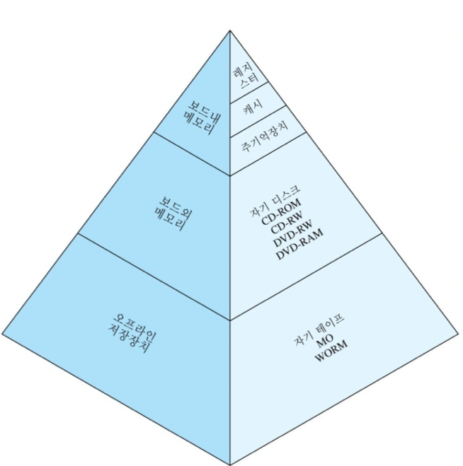 - 윗 단계일 수록 접근 시간이 짧고, 저장가능 크기가 작음.