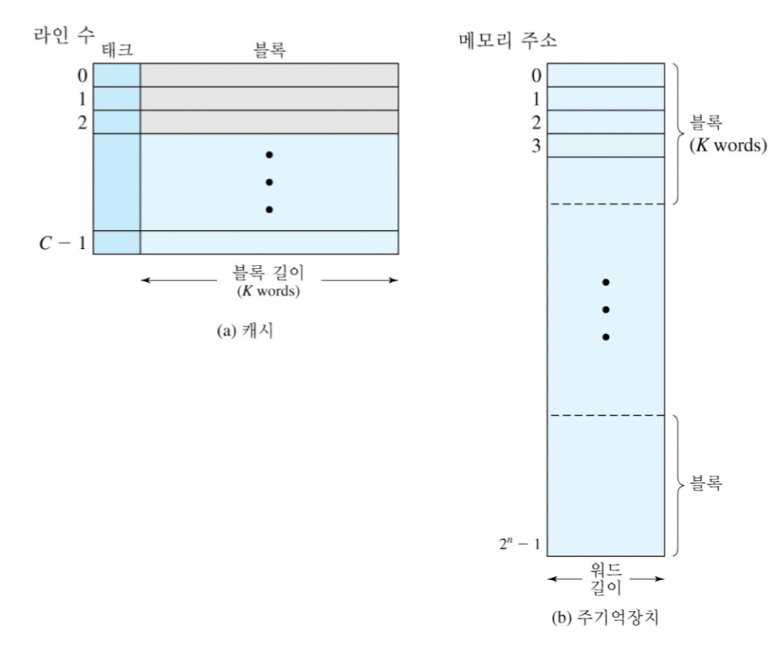 - 블록의 크기 : 캐시와 메인 메모리 사이에 교환되는 데이터 단위