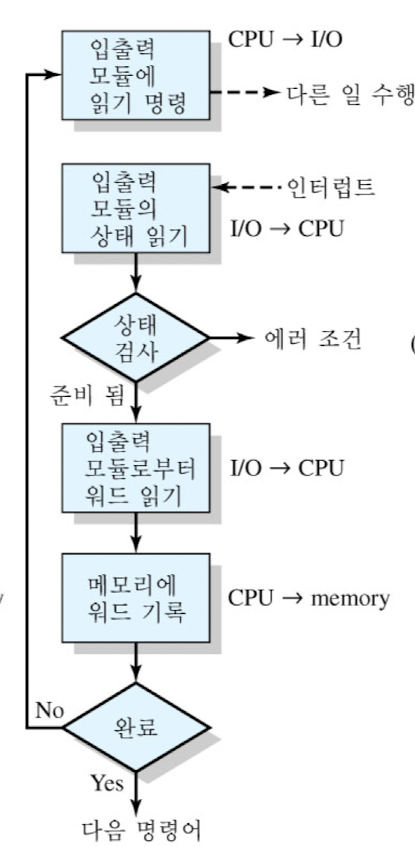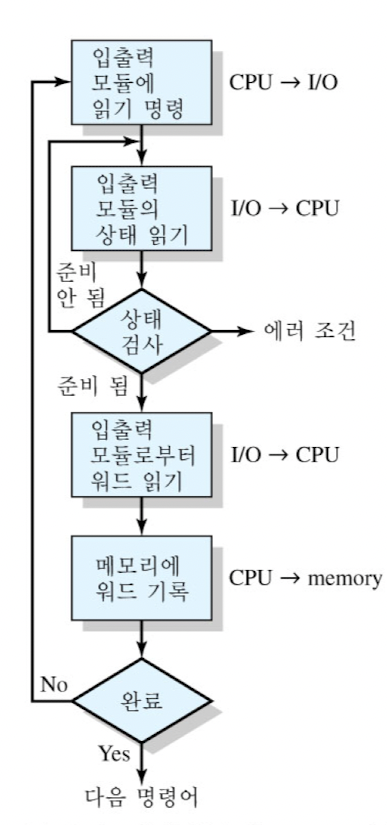 - 블록이 교체될 때마다 씀 : 메모리 쓰기 연산을 최소화, 단 메모리가 쓸데 없는 자료를 저장하고 있어야 -> 직접 메모리 접근 방해 가능성입출력 통신 기술CPU는 I/O 연산이 끝날 때까지 I/O 모듈의 상태를 주기적으로 체크