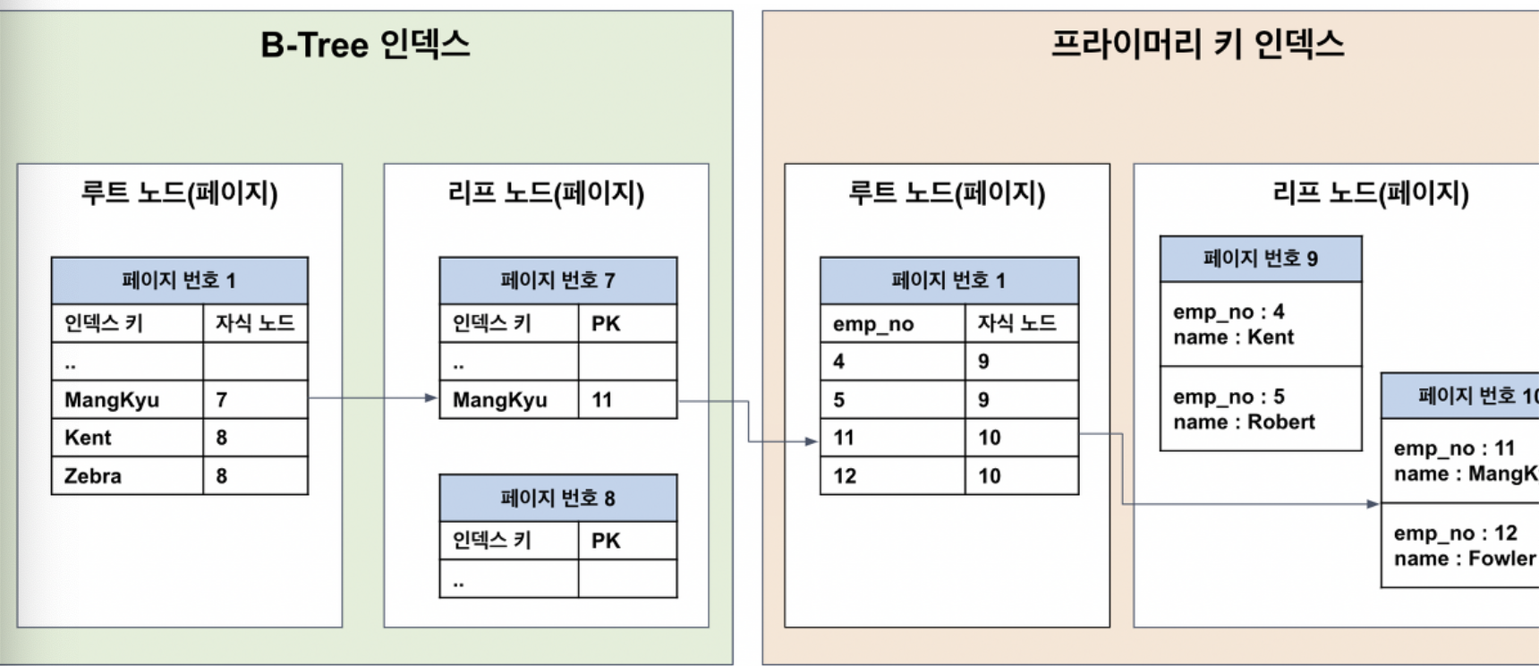 - 리프 노드만 인덱스와 함께 데이터를 가지고 있음