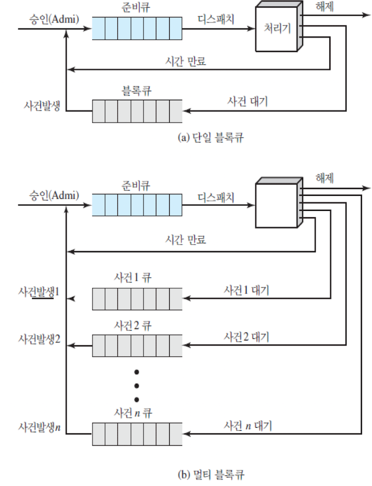 - 블록 -> 준비 : 블록 상태에 있는 프로세스가 자신이 기다리던 이벤트가 발생하면 준비 상태로 전이