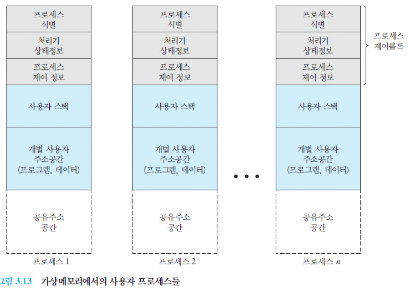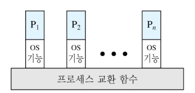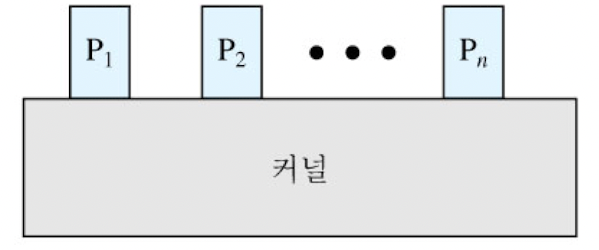 - 운영체제 코드와 데이터는 공유 주소 공간에 있어 모든 사용자 프로세스에 의해 공유