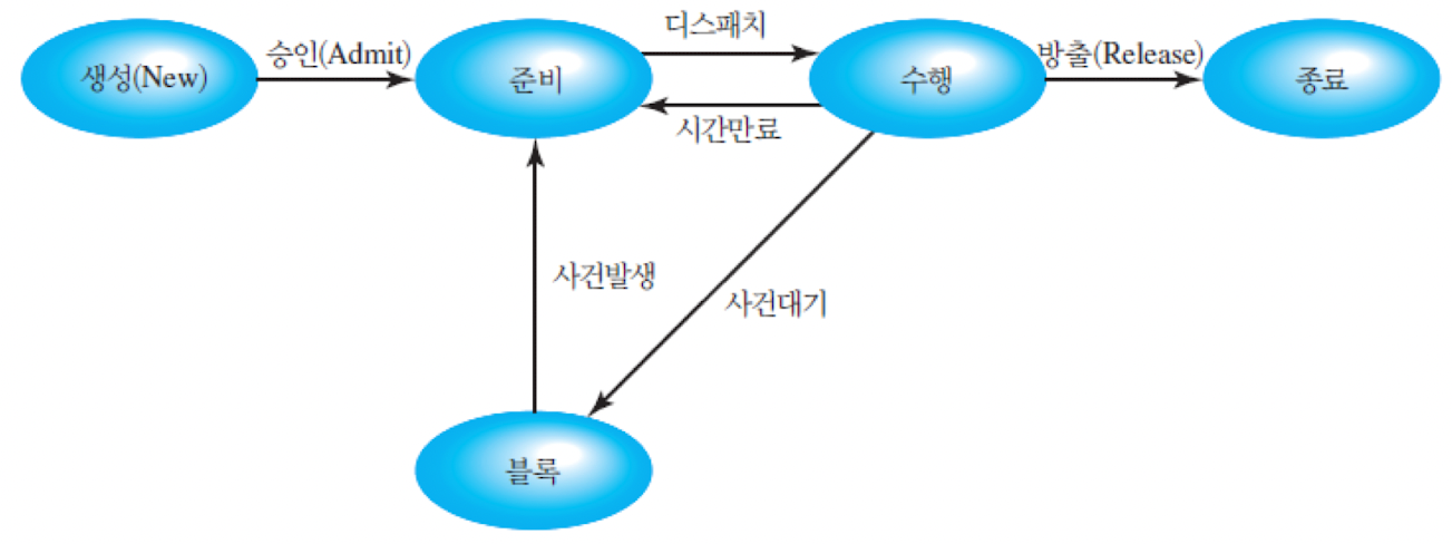- 종료(Exit) : 프로세스 수행이 완료되거나 중단되어 운영체제에 의해 프로세스 풀에서 방출된 프로세 - 생성 -> 준비 : 운영체제가 새로 생성된 프로세스를 받을 준비가 될 때 그 프로세스를 생성 상태에서 준비 상태로 전이