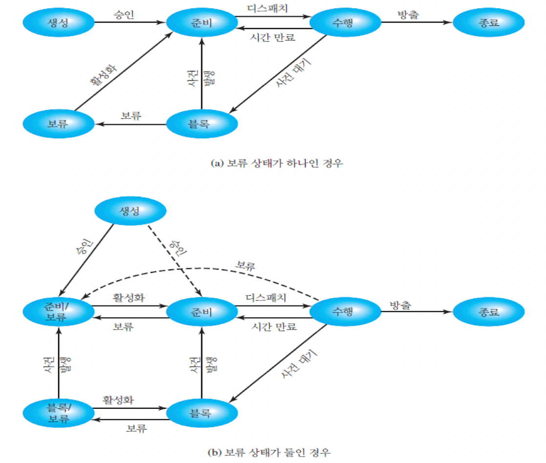 - 블록/보류 -> 준비/ 보류 : 블록/보류에 있는 프로세스가 이벤트가 발생하면 준비/보류 상태로 전이