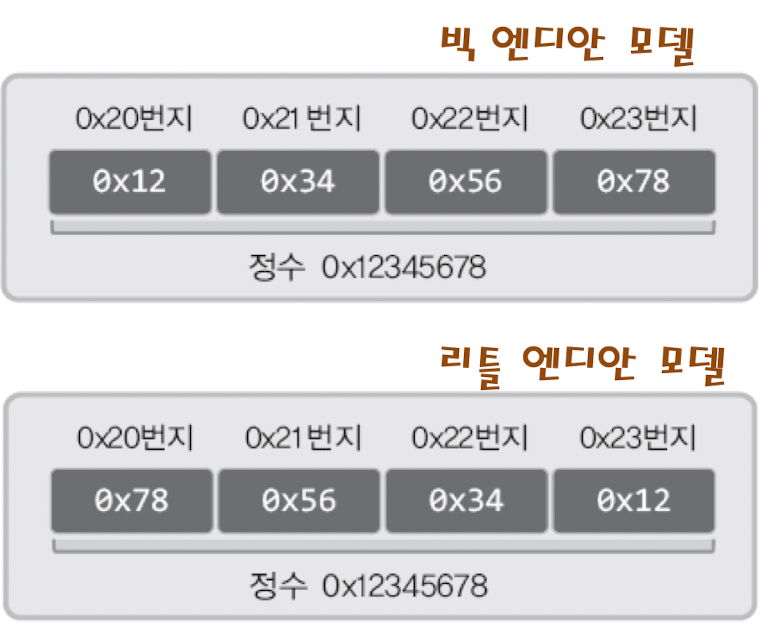 - 빅 엔디안(Big Endian) : 상위 바이트 값을 작은 번지수에 저장