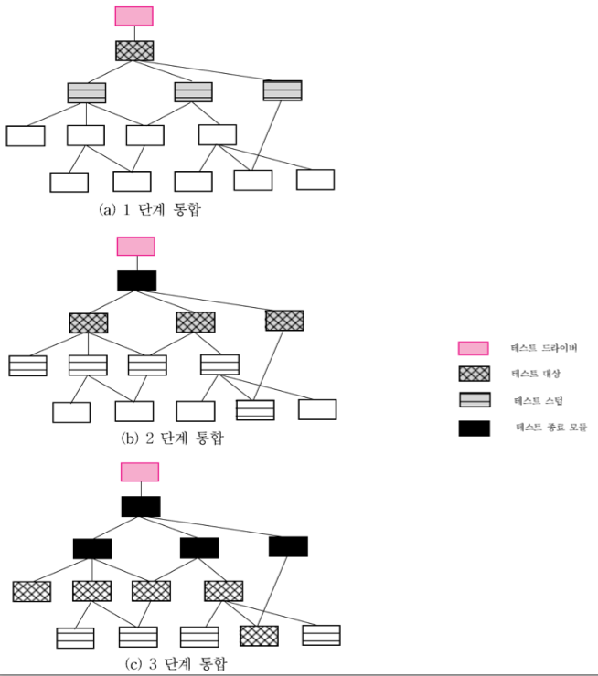 - 하향식 통합(top-down) : 시스템 구조상 최상위에 있는 모듈부터 통합