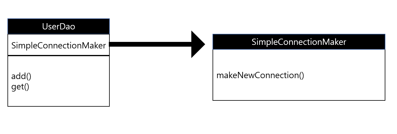 그림에 나와있는 것 처럼 SimpleConnectionMaker라는 새로운 클래스를 만들고 DB 생성 기능을 그 안에 넣는다 . 그리고 UserDao에서 SimpleConnectionMaker클래스의 오브젝트를 만들어두고, 이를 각 메서드에서 사용하면 된다.