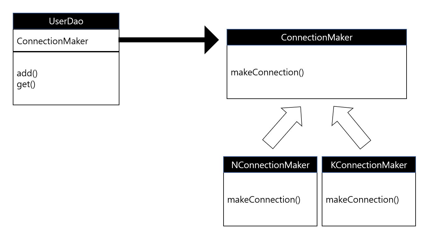 이렇게 클래스를 분리한 경우에도 두 가지 문제를 해결해야 한다. 첫쨰는 SimpleConnectionMAker메서드가 문제다. 현재 우리는 makeNewConnection()을 사용하는데 만약 카ㅋ오는 openConnection()이라는 메서드를 통해 DB커넥션을 가져온다면? 현재 UserDao의 makeNewConnection을 호출하는 부분을 전부 수정해야 하는 대참사가 발생한다.
