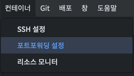 포드 포워딩 설정 : 좌상단 메뉴 > 컨테이너 > 포트포워딩 설정