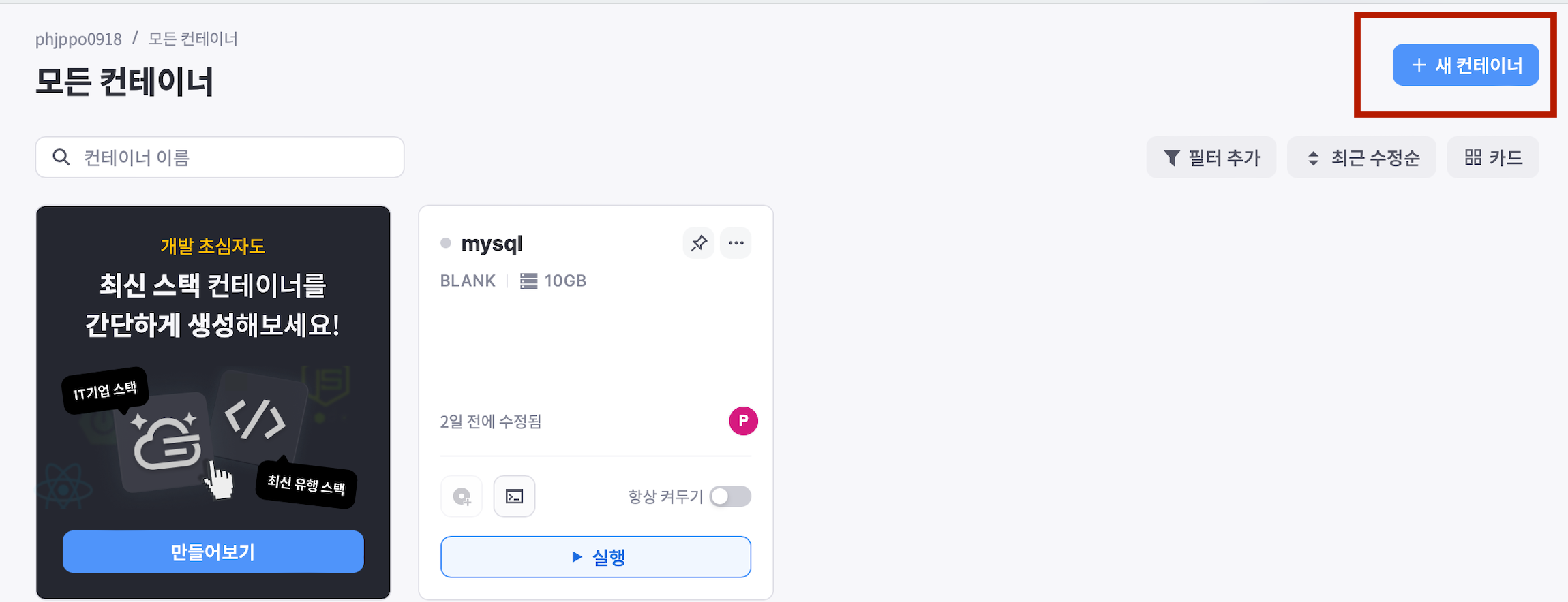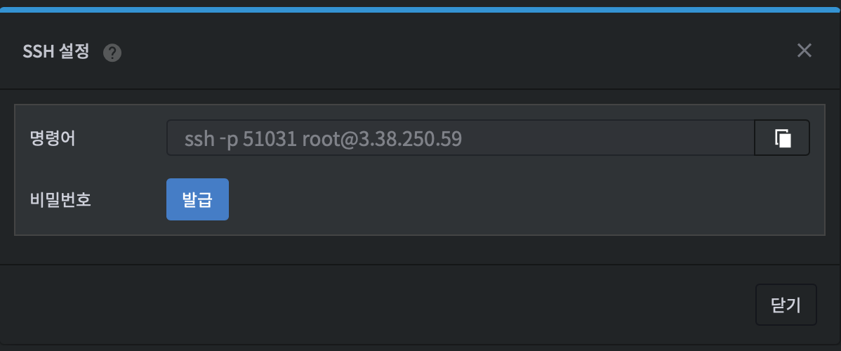 좌상단 메뉴 > 컨테이너 > SSH 설정 > 발급