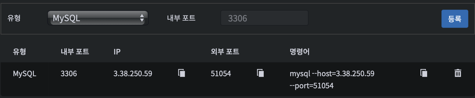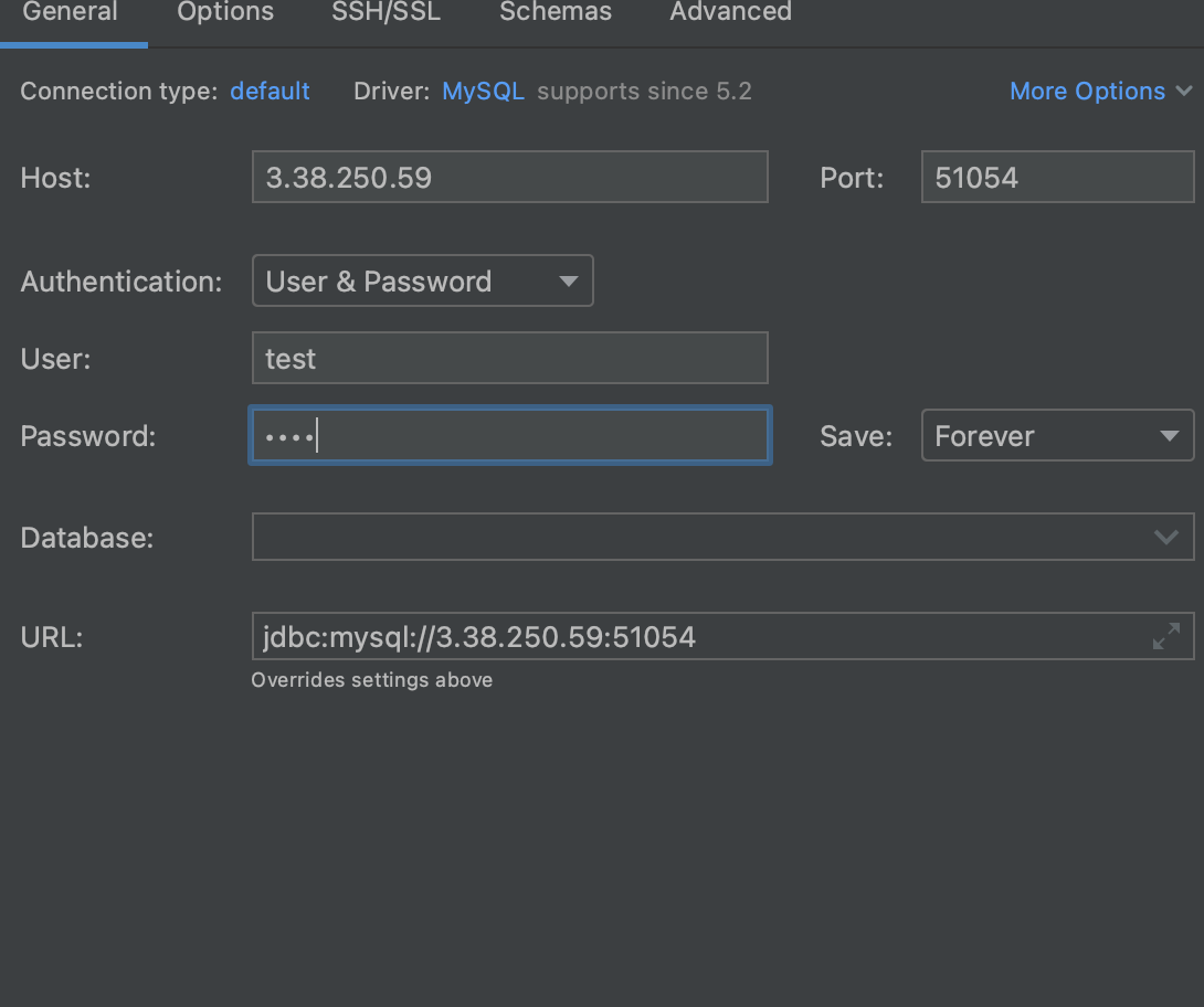 위에서 발급된 호스트, 포트번호 입력하고 생성한 유저 아이디 및 비밀번호 입력