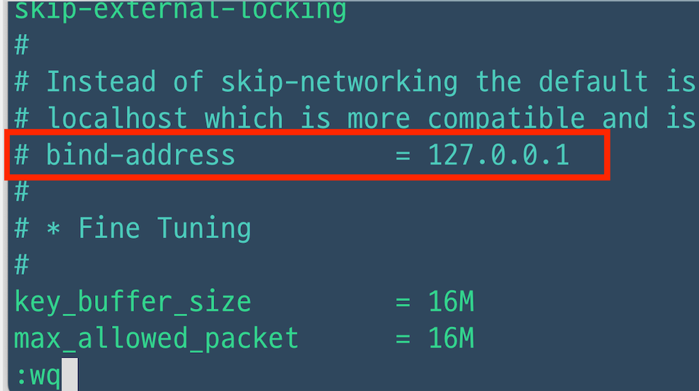 bind address 부분 주석 (vi에서 입력 [i]) 입력 후 # 입력