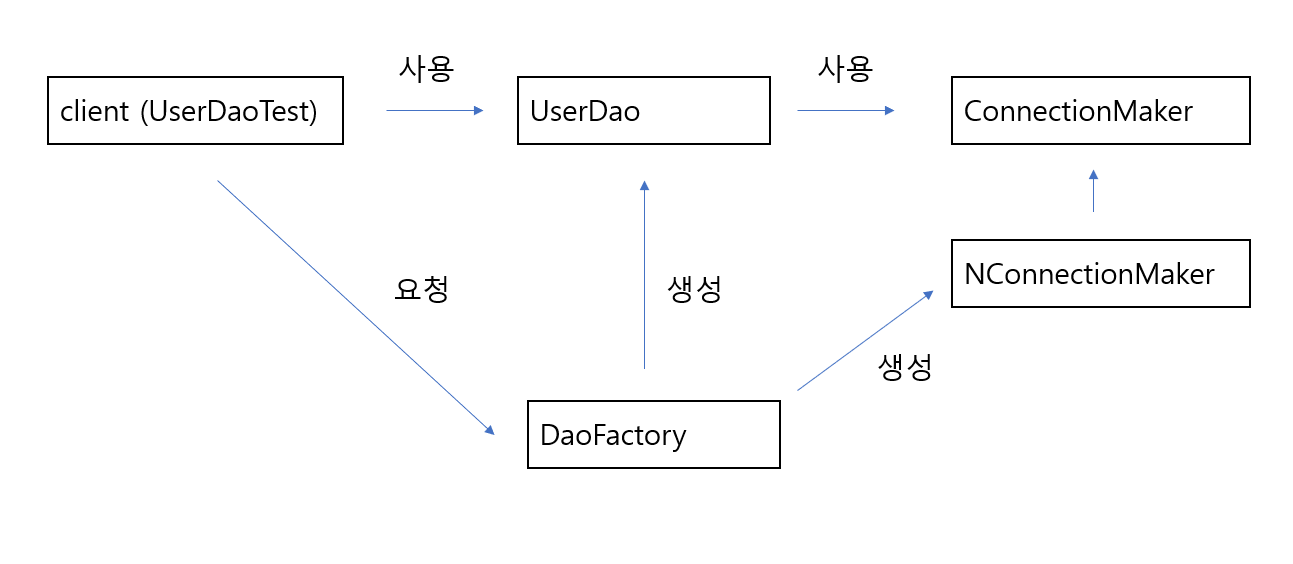 DaoFactory를 생성하여 기존에 UserDaoTest가 책임지고 있었던 관계 설정 부분을 옮기자