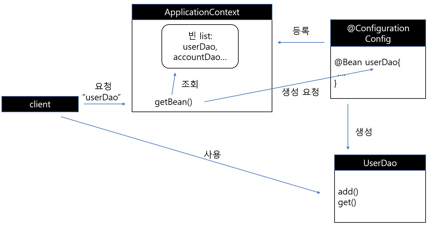 애플리케이션 컨텍스트는 Config클래스를 설정정보로 등록해두고 @Bean이 붙은 메서드의 이름을 가져와 빈 목록을 만들어둔다. 클라이언트가 애플리케이션 컨텍스트의 getBean() 메서드를 호출하면 자신의 빈 목록에서 요청한 이름이 있는지 찾고, 있다면 빈을 생성하는 메서드를 호출해서 오브젝트를 생성시킨 후 클라이언트에 돌려준다.