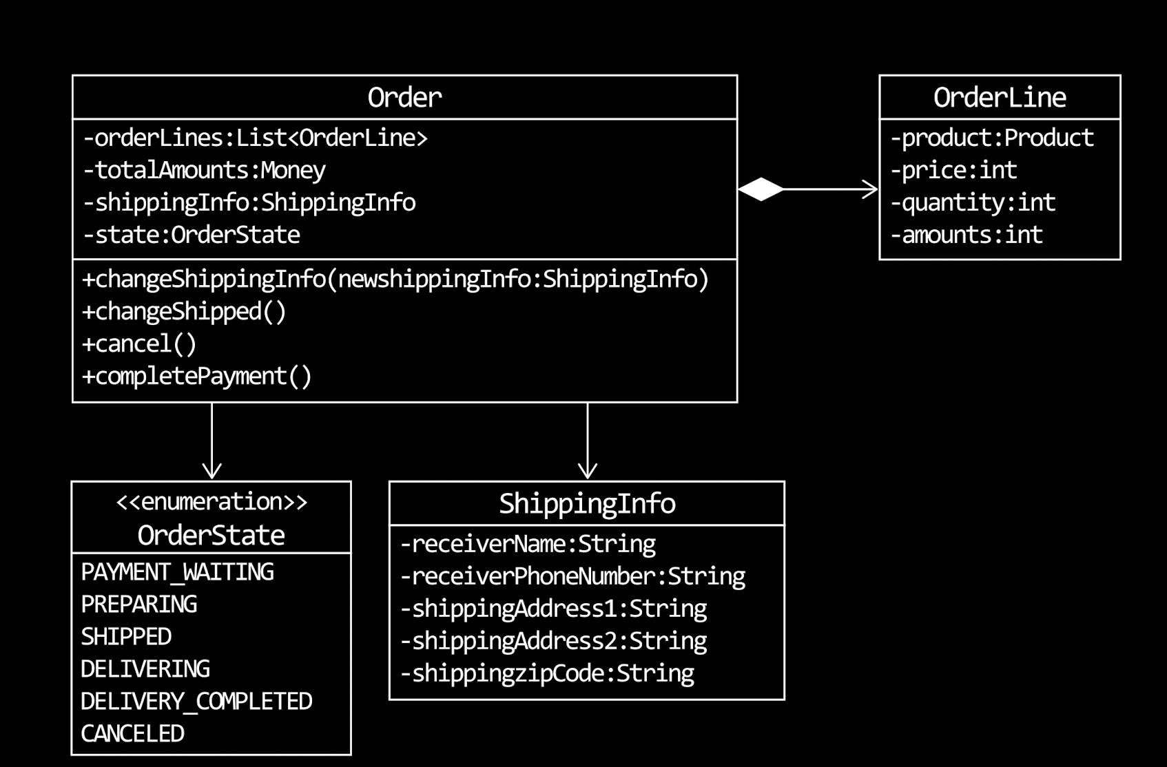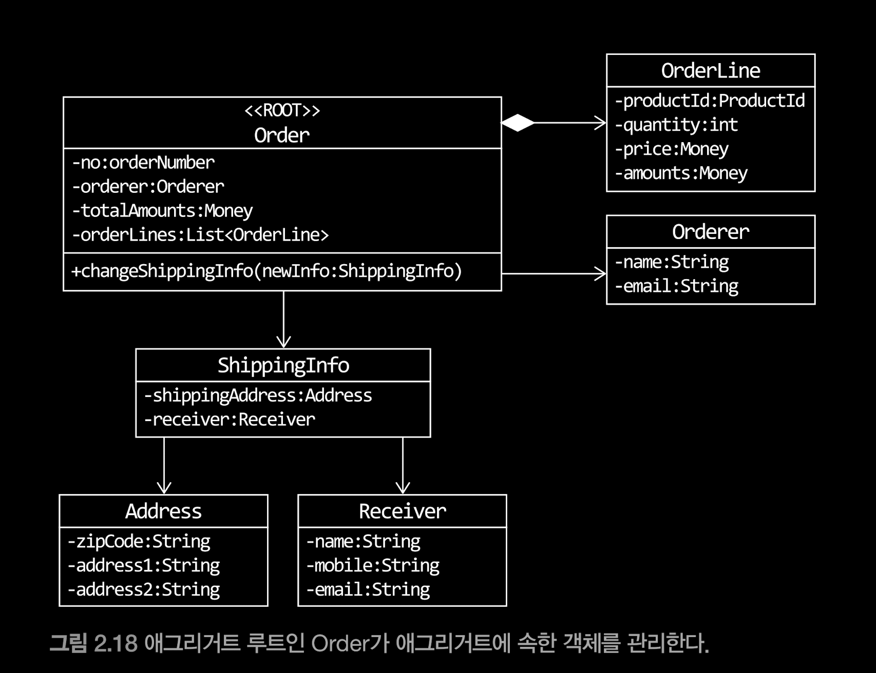 - order 애그리거트는 orderLine, Orderer 등 모든 구성 요소를 포함해야