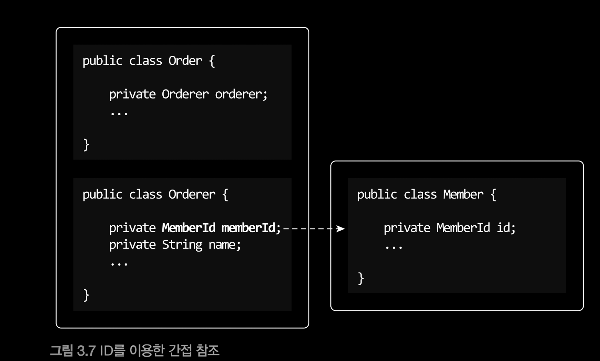 - 다른 애그리거트 잠조시 ID만을 이용해서 참조