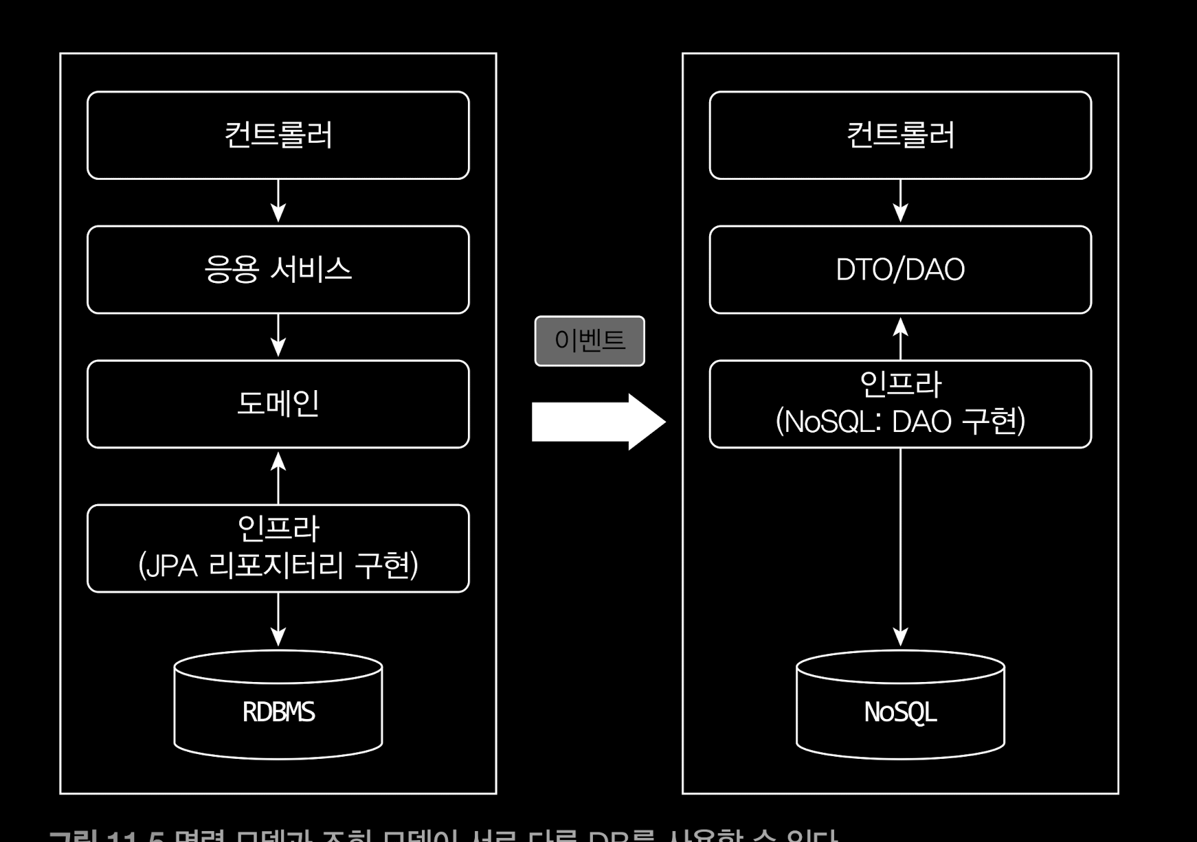 - 두 데이터 저장소 간 데이터 동기환느 이벤트를 활용해서 처리