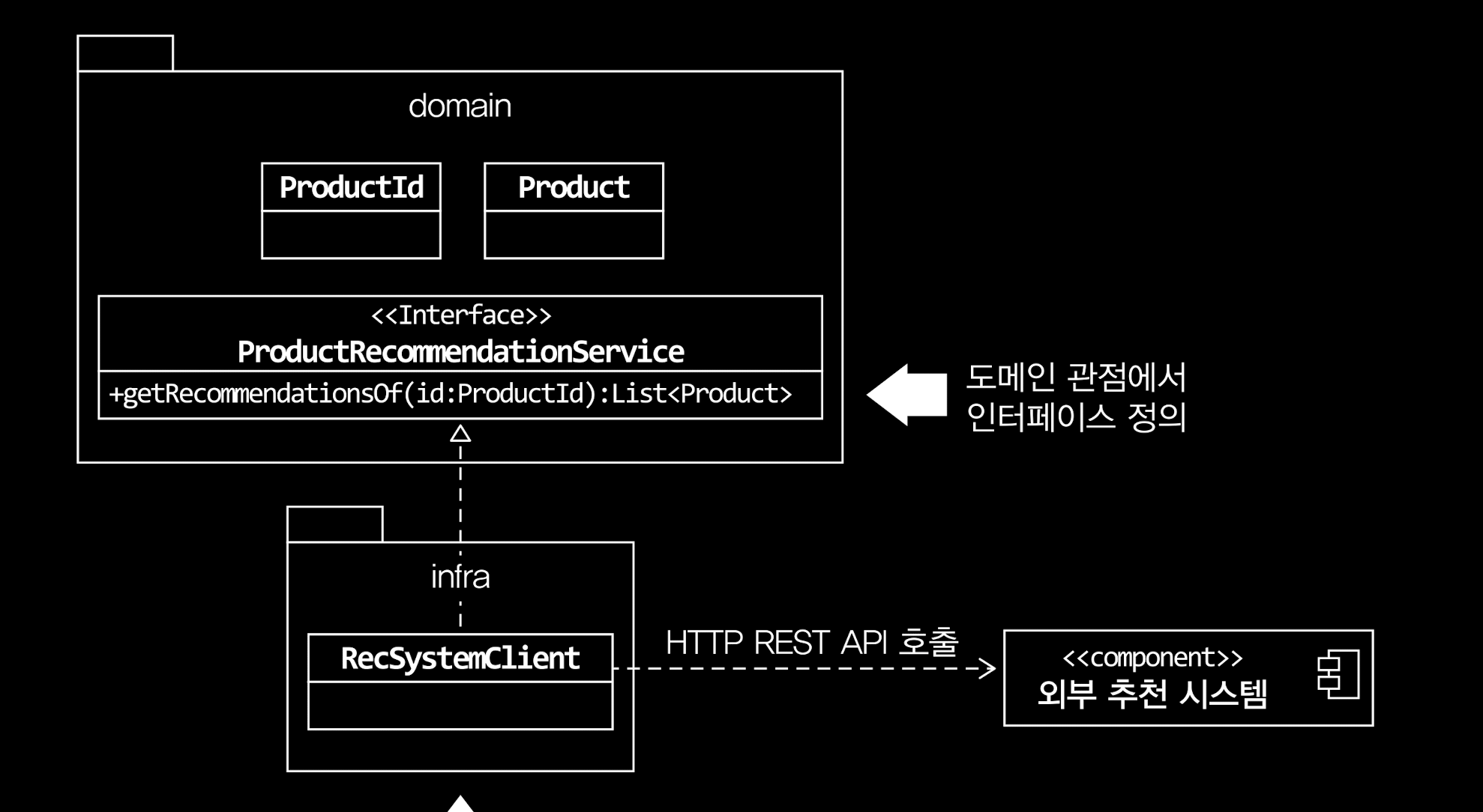 - 도메인 로직을 외부 시스템이나 별도 엔진을 이용해서 구현할 때 인터페이스와 클래스 분리